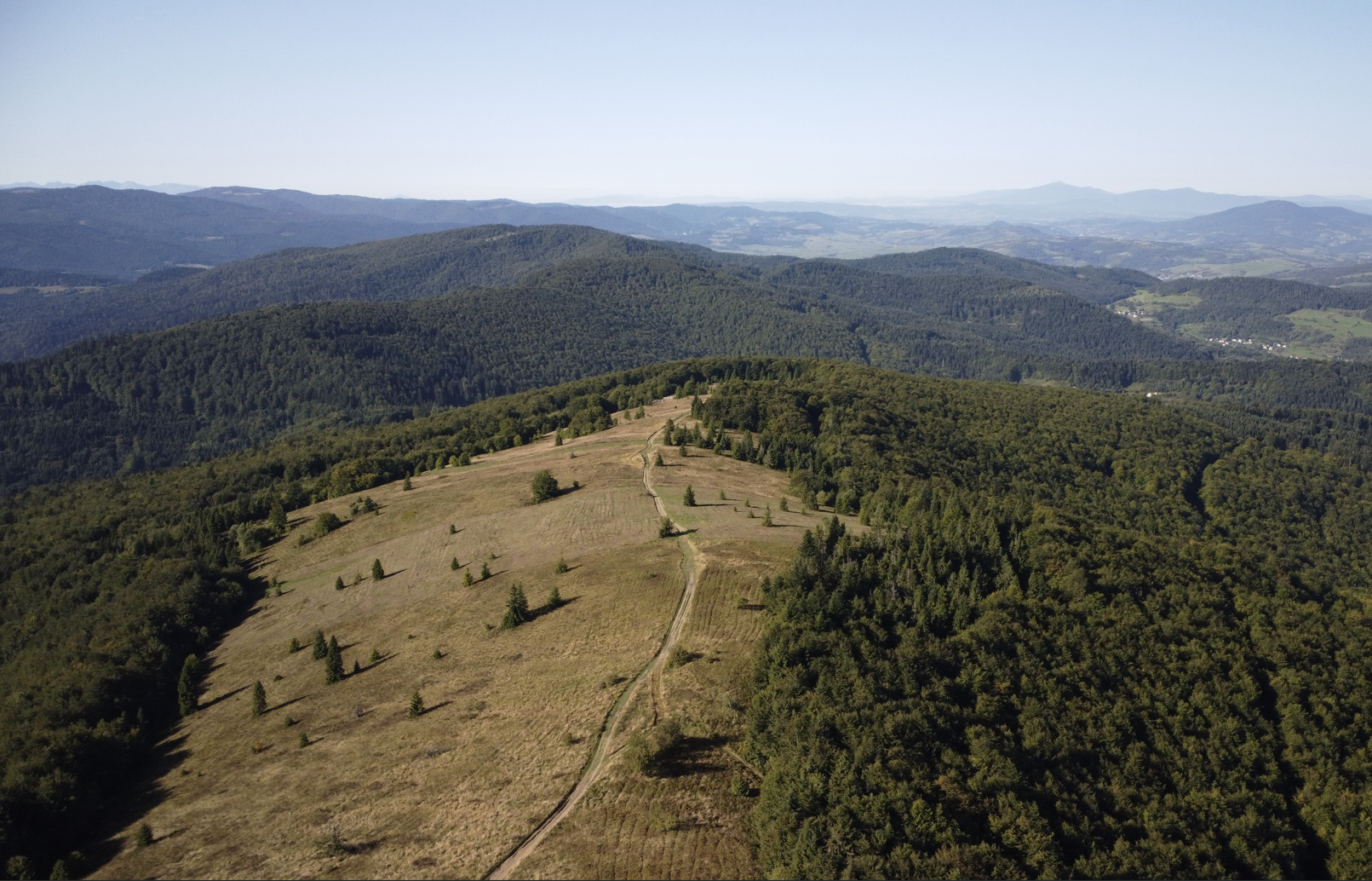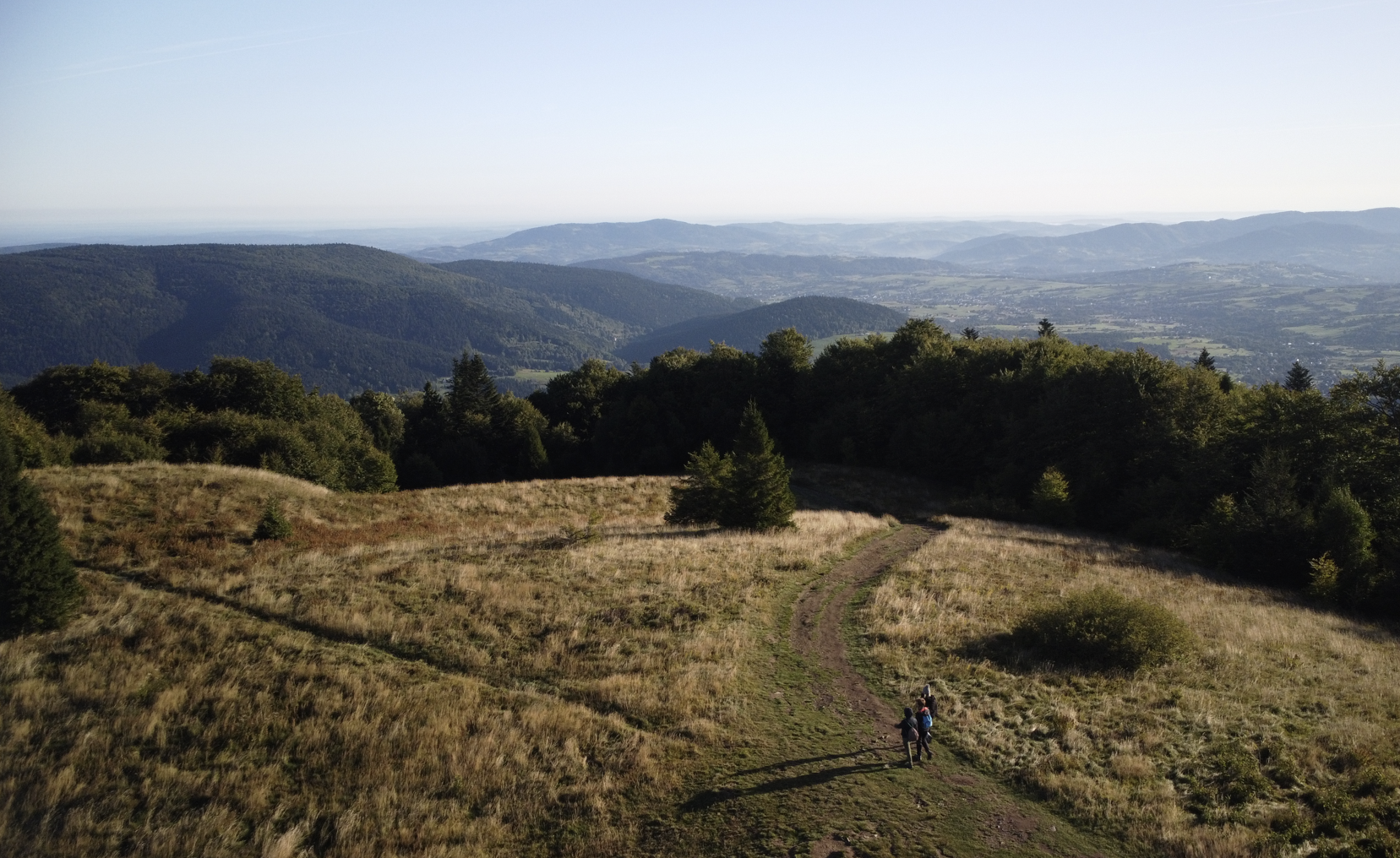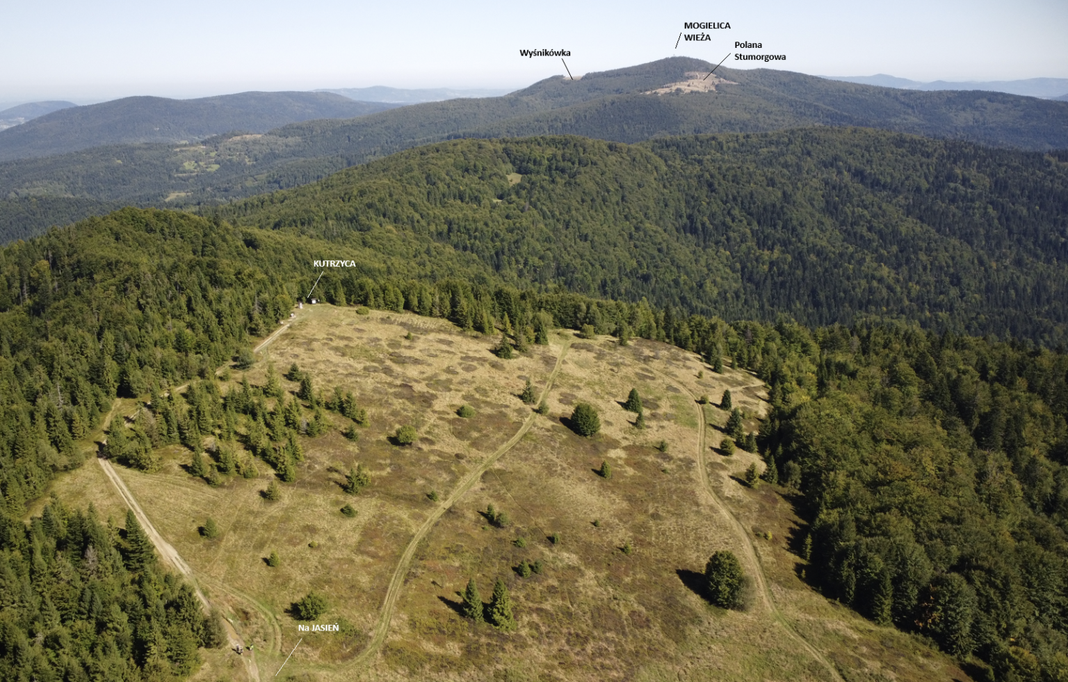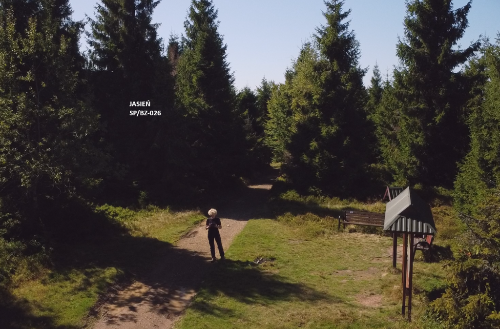 Na Jasieniu – dwie ławeczki, tabliczka i dość miejsca, by ponownie wypuścić drona. Mogłam z góry podziwiać trasę, którą od Wyśnikówki aż tutaj przeszłam. To było to, na co czekałam – widok, którego z wieży na Mogielicy nie widać, a dron pokazuje jak na dłoni.