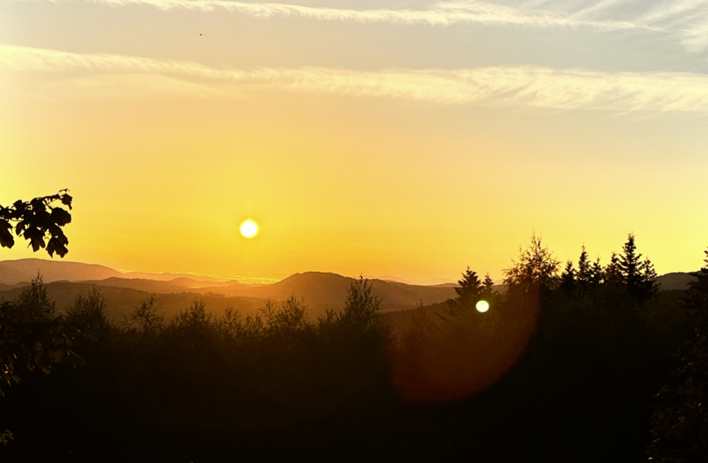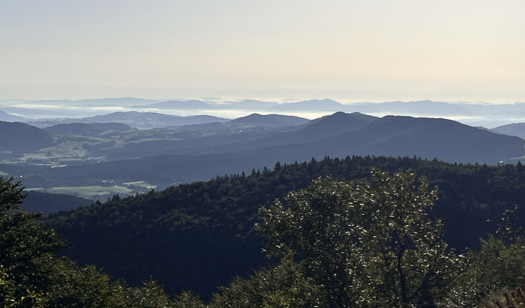 Wyruszyłam o 6 rano, tuż po wschodzie. Szlak od razu wchodzi w las i… zong – ciemno jak w radiu podczas zaniku propagacji ⚡. Na szczęście krótko. Potem asfalt, znów las – i tak prawie do samego szczytu.